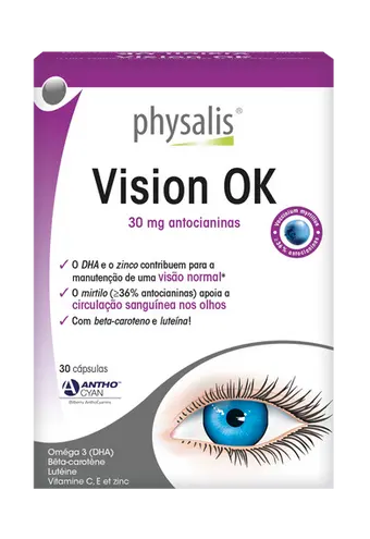 Suplemento Alimentar à base de plantas e de nutrientes. Physalis Vision Ok contém zinco e óleo de peixe com um teor de 70% de ácidos gordos omega-3 DHA, que contribuem para a manutenção de uma visão normal. Esta ação é reforçada pela adição de beta-caroteno natural, que é transformado no organismo em vitamina A. As vitaminas C e E ajudam a proteger as células contra as oxidações indesejáveis. Contém ainda uma extrato de mirtilo, com 36% de antocianinas que participam na circulação do sangue nos olhos, e luteína. (* O efeito benéfico é obtido com uma dose diária de 250 mg de DHA.)